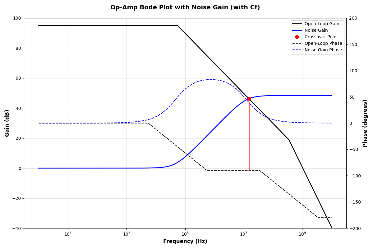 The phase margin is the difference between the noise phase shift and the op-amp’s phase shift, minus -180°. Clearly, with this parameter configuration, the phase margin is a mere 0.2°, meaning this circuit will almost certainly self-oscillate and fail to amplify current signals properly, especially in high frequency cases.