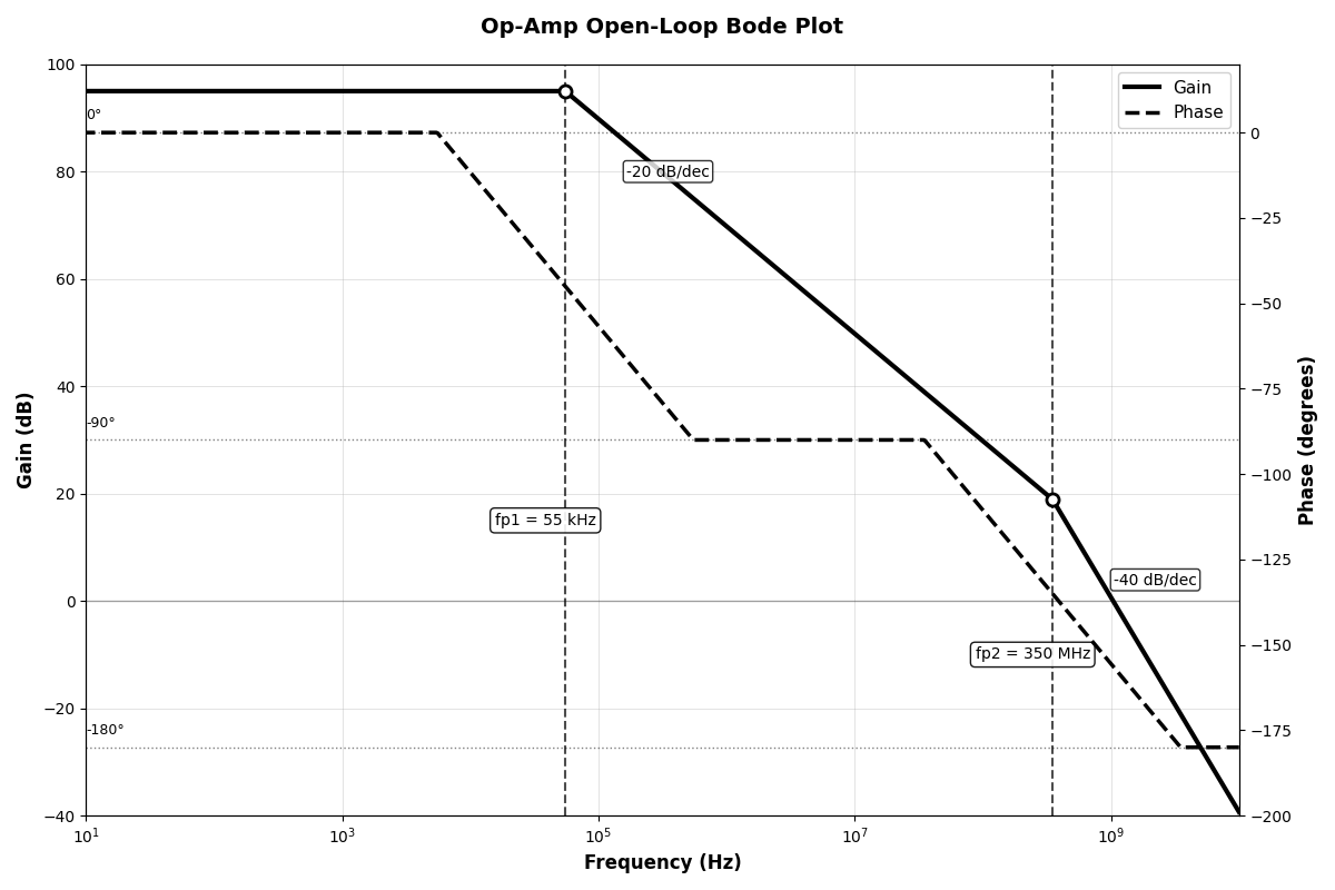 In engineering, op-amps are obviously not ideal. Op-amps are composed of basic components like resistors, capacitors and MOSFETs. These basic components, in conjunction with parasitic parameters, cause the op-amp itself to possess several poles. Currently op-amps in the market works under GHz level. In such frequency range we ususally take two poles into consideration. The first (with lower frequency) is called dominant pole, while the second is just called second pole. With poles in the op-amp taken into consideration, the open-loop gain becomes a function relative to frequency.