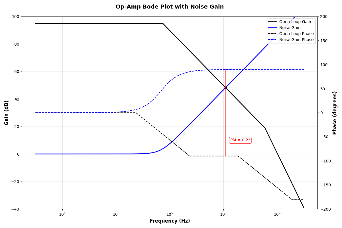 The phase margin is the difference between the noise phase shift and the op-amp’s phase shift, minus -180°. Clearly, with this parameter configuration, the phase margin is a mere 0.2°, meaning this circuit will almost certainly self-oscillate and fail to amplify current signals properly, especially in high frequency cases.
