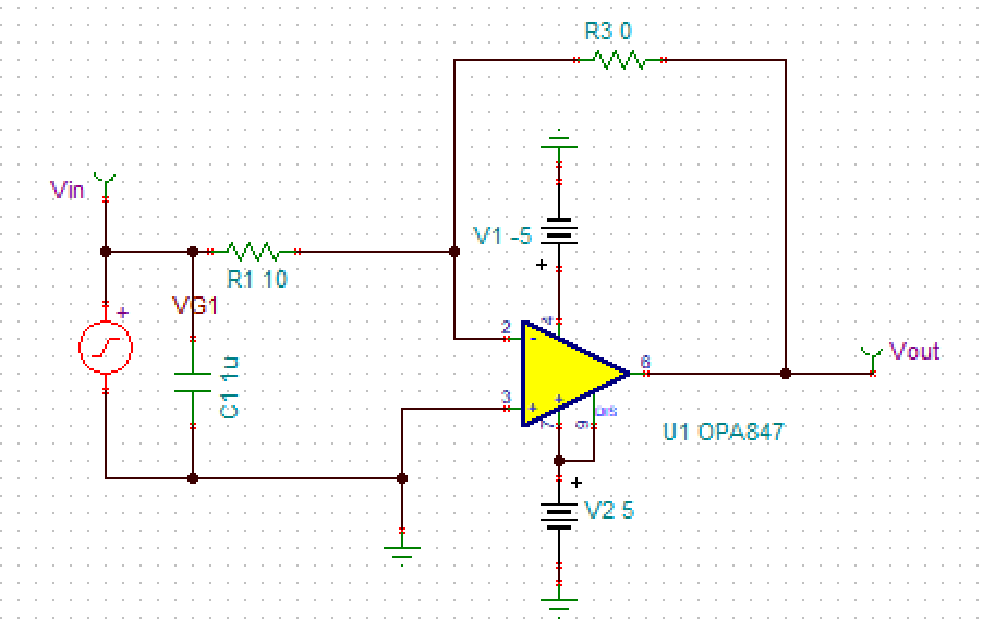 Besides, OPA847 requires a gain over 12 V/V for stability. Check the noise gain curve. At high frequency region, impedance is dominant by the capacitance. Thus the high frequency gain is